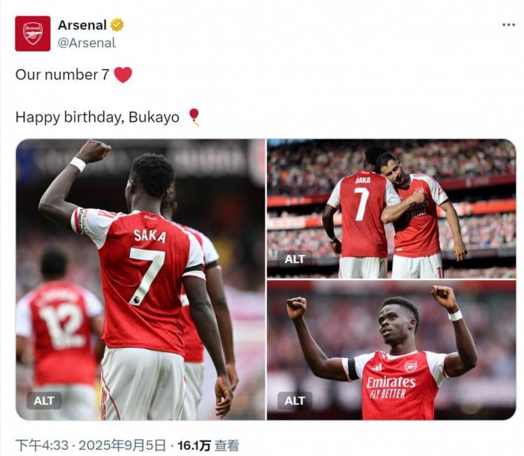 阿森纳官方社媒晒出萨卡的照片,配文:“我们的7号,生日快乐,布卡约(萨卡)!”