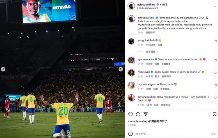 巴西在本轮世预赛3-0完胜智利,蓝军小将埃斯特旺倒钩打进个人国家队生涯首球。